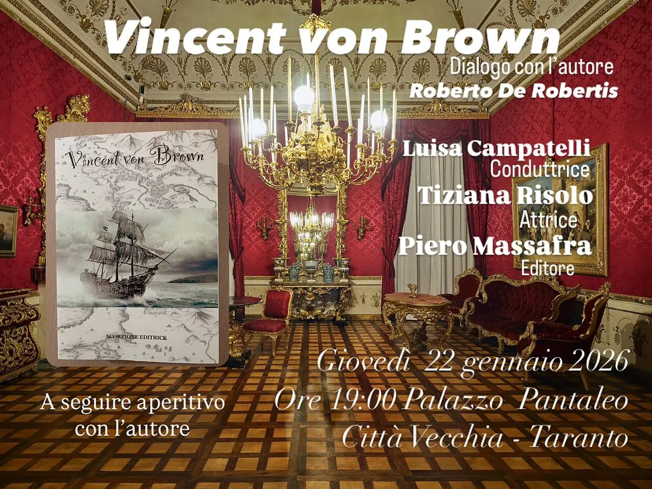 Le nobili sale settecentesche di Palazzo Pantaleo, nel cuore della Città Vecchia di Taranto, faranno da cornice, giovedì 22 gennaio, alla seconda presentazione del romanzo “Vincent von Brown. Una storia personale”, firmato da Roberto de Robertis e pubblicato da Scorpione Editrice.