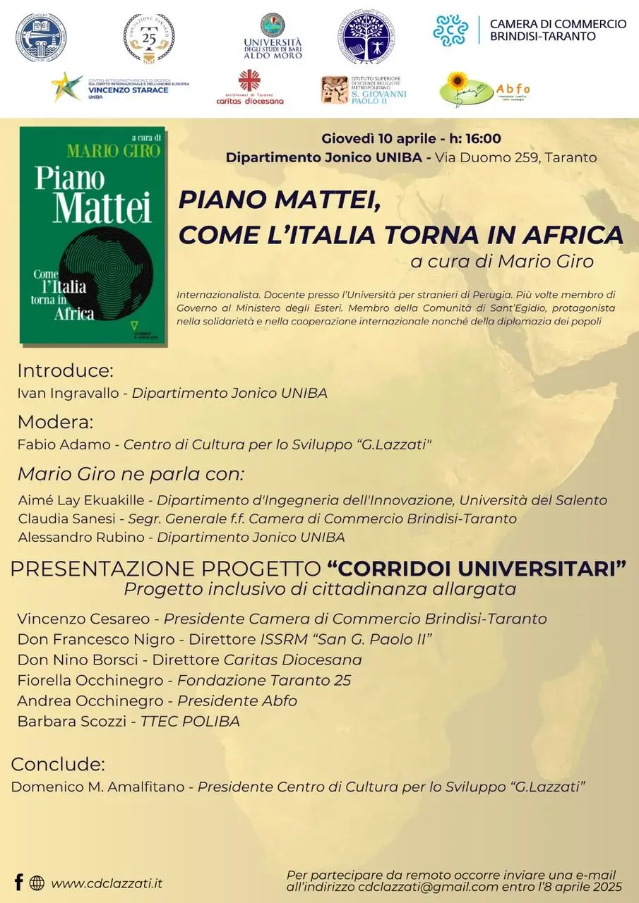 Giovedì 10 aprile 2025 Taranto darà ufficialmente il via a un progetto ambizioso e innovativo: l’attivazione di un corridoio universitario per rifugiati sotto l’egida dell’UNHCR. L’iniziativa sarà inaugurata con un doppio appuntamento, tra cui la presentazione del libro “Piano Mattei. Come l’Italia torna in Africa” di Mario Giro, protagonista della diplomazia dei popoli, docente e già membro del Ministero degli Esteri, presso il Dipartimento Jonico dell’Università di Bari (sede di via Duomo, ore 16).