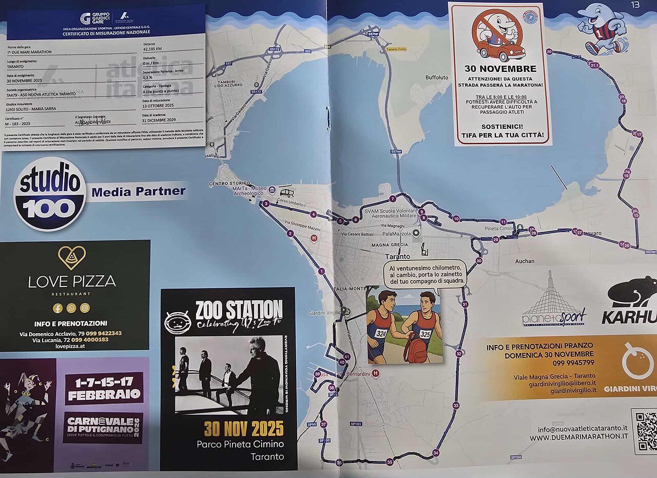 La gara si svolgerà domenica 30 novembre 2025, con partenza e arrivo su Viale Virgilio, e attraverserà luoghi normalmente non accessibili al pubblico: l’Arsenale Militare, la SVAM, le aree naturalistiche del Mar Piccolo e il suggestivo tratto finale a fianco delle navi della Marina Militare della Stazione Navale Mar Grande.