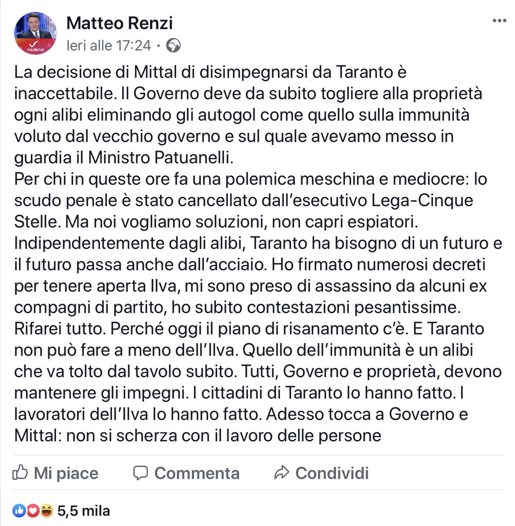 La decisione di Mittal di disimpegnarsi da Taranto è inaccettabile. Il Governo deve da subito togliere alla proprietà ogni alibi eliminando gli autogol come quello sulla immunità voluto dal vecchio governo e sul quale avevamo messo in guardia il Ministro Patuanelli. Per chi in queste ore fa una polemica meschina e mediocre: lo scudo penale è stato cancellato dall’esecutivo Lega-Cinque Stelle. Ma noi vogliamo soluzioni, non capri espiatori. Indipendentemente dagli alibi, Taranto ha bisogno di un futuro e il futuro passa anche dall’acciaio. Ho firmato numerosi decreti per tenere aperta Ilva, mi sono preso di assassino da alcuni ex compagni di partito, ho subito contestazioni pesantissime. Rifarei tutto. Perché oggi il piano di risanamento c’è. E Taranto non può fare a meno dell’Ilva. Quello dell’immunità è un alibi che va tolto dal tavolo subito. Tutti, Governo e proprietà, devono mantenere gli impegni. I cittadini di Taranto lo hanno fatto. I lavoratori dell’Ilva lo hanno fatto. Adesso tocca a Governo e Mittal: non si scherza con il lavoro delle persone.
