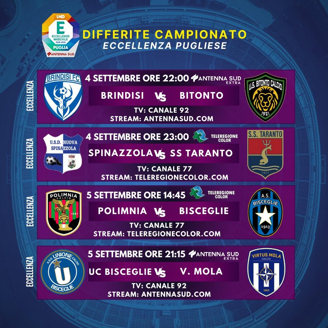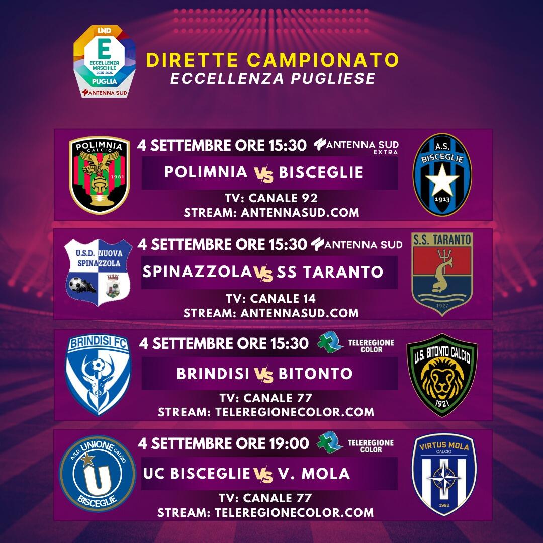 Il debutto ufficiale del nuovo Taranto nel suo primo campionato di Eccellenza sarà trasmesso in diretta da Antenna Sud. La sfida con lo Spinazzola, valida per la 2a giornata, si giocherà a Ruvo di Puglia alle 15.30 di giovedì 4 settembre e potrà essere seguita su Antenna Sud, canale 14 del digitale terrestre, e in streaming su antennasud.com. La gara sarà trasmessa in differita alle 23.00, sempre del 4 settembre, su Teleregione, canale 77 del digitale terrestre, e in streaming su teleregionecolor.com. Di seguito, il programma completo delle dirette e delle differite del campionato di Eccellenza pugliese proposto dal Gruppo editoriale Distante.