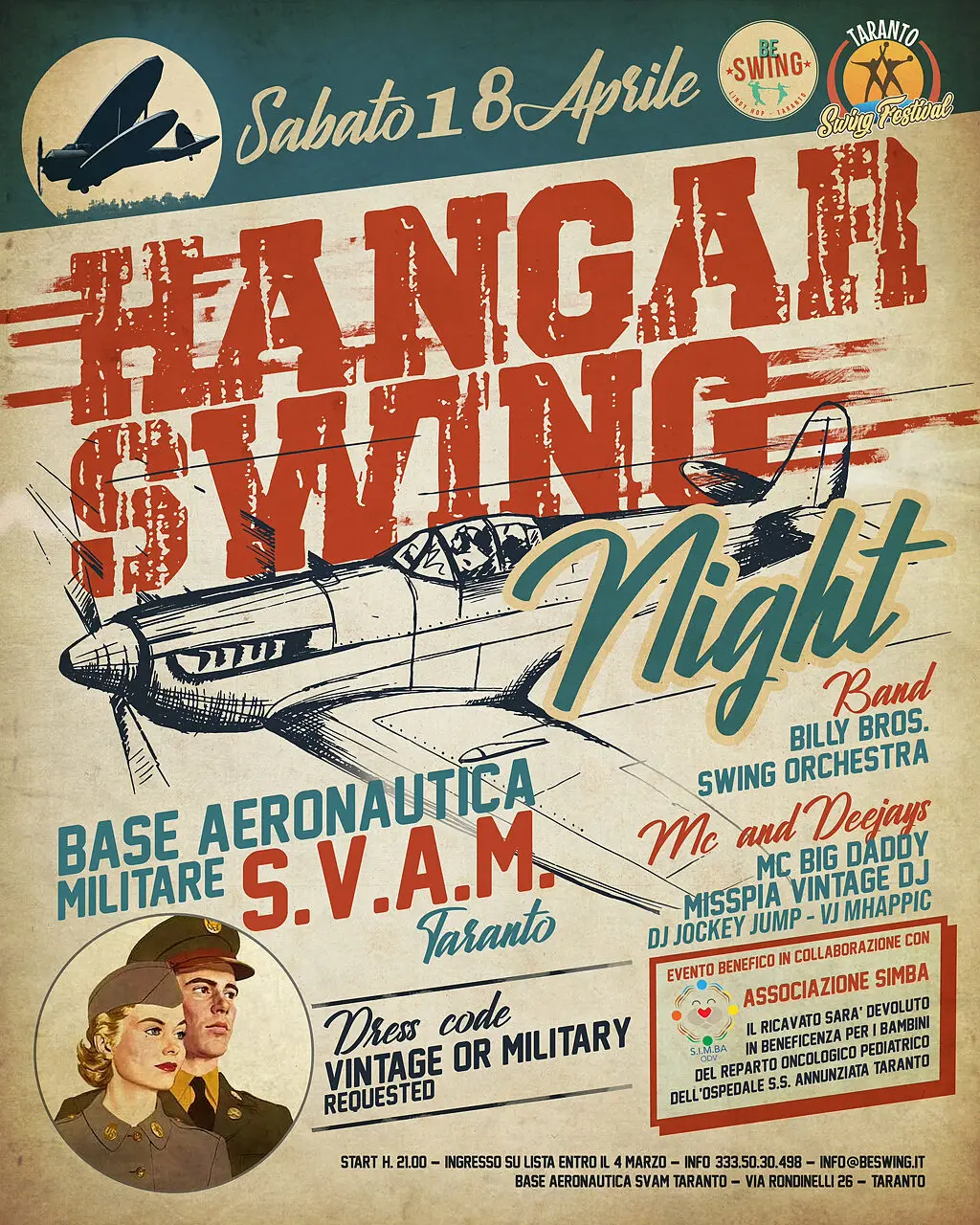 Oltre alla musica e al ballo, l’Hangar Swing Night avrà un’importante finalità benefica. L’evento avrà luogo all’interno dell’Hangar S100 della Scuola Volontari dell’Aeronautica Militare, sempre attenta nel sostenere attività di carattere sociale e finalizzate a scopo benefico che, in questo caso, grazie alla collaborazione con l’Associazione S.I.M.BA ODV di Taranto, consentirà di devolvere il ricavato dell’evento a sostegno dei bambini ricoverati nel reparto di oncologia dell’Ospedale S.S. Annunziata di Taranto.