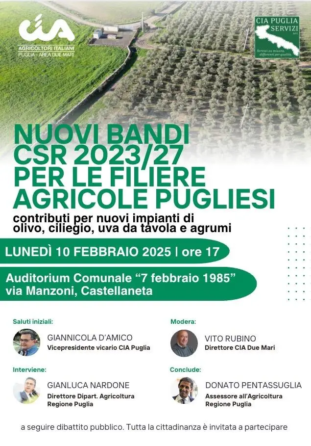 L’evento, moderato dal direttore CIA Due Mari Vito Rubino, è aperto a tutta la cittadinanza.