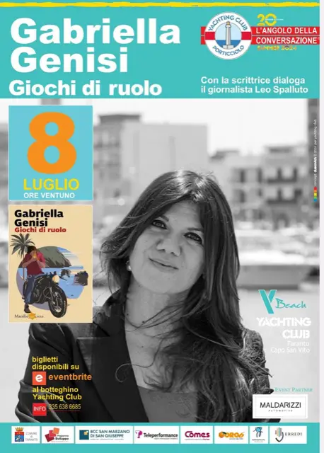 Nell’ambito della rassegna l’Angolo della Conversazione, sarà ospite dello stabilimento balneare di San Vito la scrittrice pugliese Gabriella Genisi, la giallista più amata d’Italia, colei che ha dato vita alla fortunata serie di Lolita Lobosco, l'omologo femminile del Commissario Montalbano.