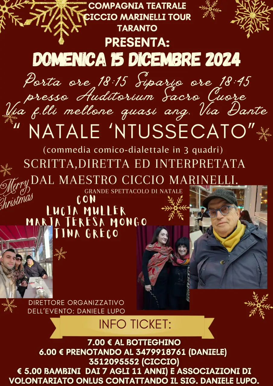 L’evento, un’occasione perfetta per scambiarsi gli auguri di Natale e fine anno, si terrà domenica 15 dicembre alle 18:45 al Teatro Auditorium Sacro Cuore in via Fratelli Mellone, a due passi da via Dante. Lo spettacolo sarà diviso in tre quadri e racconterà, con umorismo e affetto, la storia di una famiglia tarantina.