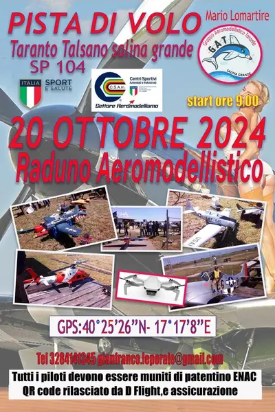Domenica 20 ottobre 2024, nella pista del GAT di Talsano (Salina Grande), si terrà il consueto raduno annuale di aeromodellismo dinamico,...