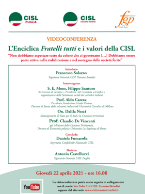 L’Enciclica Fratelli tutti e i valori della CISL: è il tema del webinar organizzato dalla Cisl Taranto Brindisi, insieme con la Cisl Puglia e la...