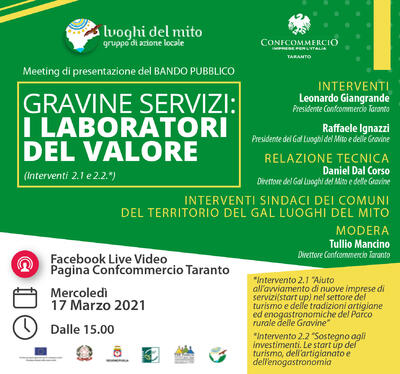 Domani, mercoledì 17 marzo alle ore 15.00, meeting di presentazione del nuovo bando pubblico del Gal Luoghi del Mito e delle Gravine, in diretta...