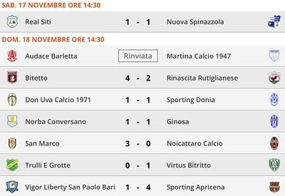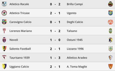 A. Aradeo-LM Scorrano 0-1 (1-3) Deghi-Novoli 3-0 (2-2) Martina-Talsano 6-0 (3-0) 15′ e 28′ Amodio, 17′, 25′ e...