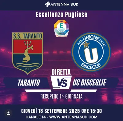 Giovedì 18 settembre, alle 15:30, lo stadio Italia di Massafra ospiterà la sfida tra Taranto e UC Bisceglie, valida per il recupero della prima...