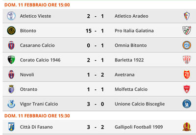 Atletico Vieste-UC Bisceglie 3-2 Avetrana-Barletta 0-0 sospesa al 10’st per impraticabilità di campo Bitonto-Fasano 0-2...