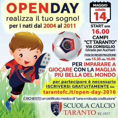 Il Taranto FC 1927 comunica che sabato 14 maggio dalle ore 16.00 andrà in scena il primo OPEN DAY 2016 riservato a tutti i bambini nati dal...