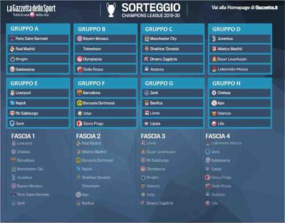 Questi i gironi della Champions League delle quattro squadre italiane, come definiti dal sorteggio Uefa: GRUPPO C: Manchester City (Ing), Shaktar...