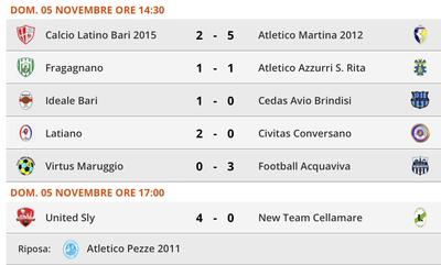 Atletico Martina-Acquaviva 2-1 Latino Bari-Civitas Conversano 4-0 Fragagnano-Cedas Avio Brindisi 2-6 Latiano-New Team Cellamare 2-0 Virtus...