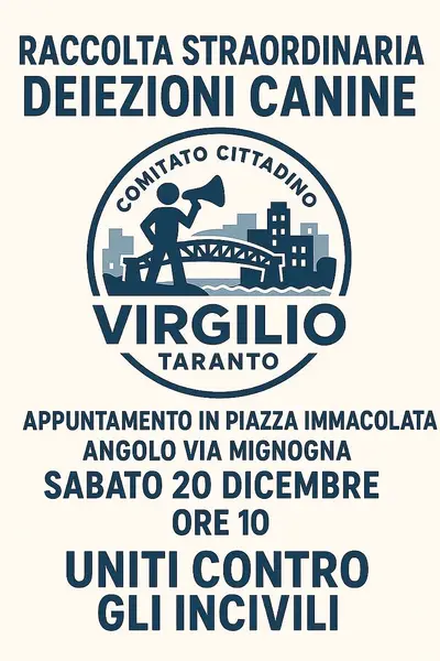 Si svolgerà sabato 20 dicembre alle ore 10:00 in piazza Immacolata a Taranto angolo via Mignogna la “raccolta straordinaria deiezioni canine”,...