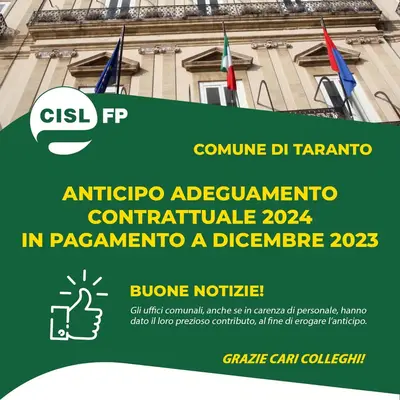 Comune di Taranto, anticipo contrattuale 2024 ai dipendenti grazie alla Cisl