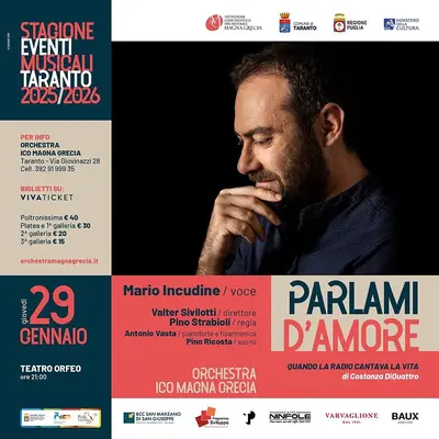 Giovedì 29 gennaio alle ore 21.00 il Teatro Orfeo di Taranto ospiterà “Parlami d’amore”, programma musicale che vede protagonista Mario...