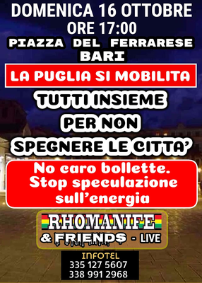 Domenica 16 ottobre, dalle 17.00 alle 23.00, in piazza del Ferrarese, a Bari, ”Tutti Insieme Per Non Spegnere le Città, la Puglia si mobilita, no...