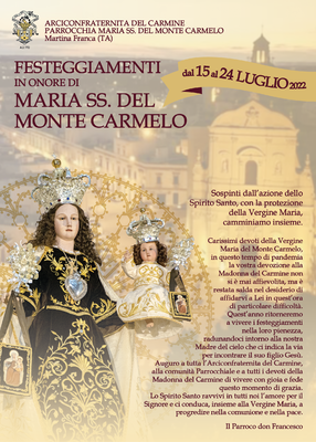 Al via i festeggiamenti in onore di Maria SS. del Monte Carmelo, cosi di seguito il programma completo della novena con inizio il 15 luglio 2022, le...