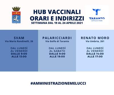 I centri vaccinali del comune di Taranto saranno aperti nella settimana dal 19 al 24 aprile nei seguenti giorni e orari: ▪️Scuola Volontari...