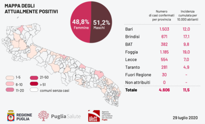 Coronavirus: 29 luglio, 10 nuovi casi in Puglia