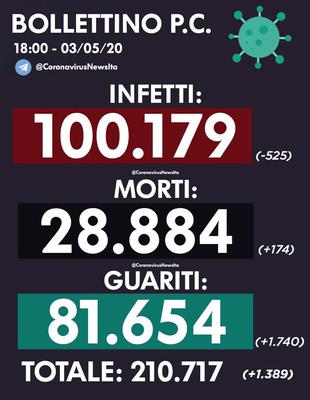 Coronavirus: In un giorno 174 morti in Italia, dato più basso da oltre 1 mese