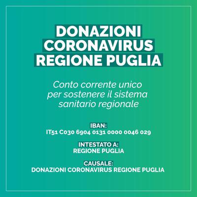 Coronavirus: Donazioni Regione Puglia, cc unico per sostenere il sistema sanitario